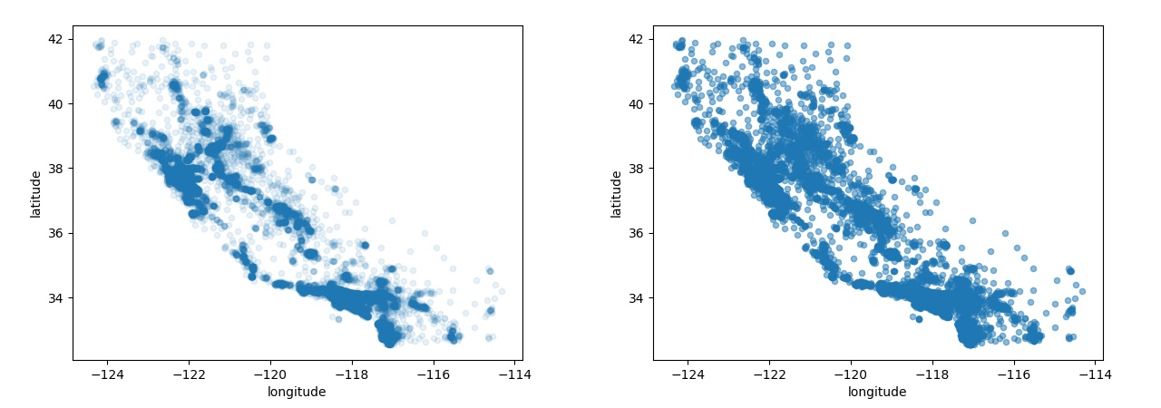 캘리포니아의 지도 모습처럼 위도, 경도의 데이터를 뿌렸지만 현재 데이터로는 데이터 분포만 알 수 있고, 점이 모두 진하기 때문에 밀집에 대해서 알기 힘이 들 수 있다. 이를 위해 색상에 대한 투명도를 설정하여 밀집이 심한 구역과 덜 심한 구역을 알 수 있게 alpha 옵션을 추가한다.