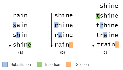 위 예시는 편집거리를 계산하는 것을 보여주는 예시로 비(rain)와 빛나다(shine)로 설명을 합니다. 우선 rain을 shine으로 변환하려면 r을 s로 바꾸고, a를 h로 바꾸고 e를 삽입합니다. 고로 이 편집거리는 3입니다.