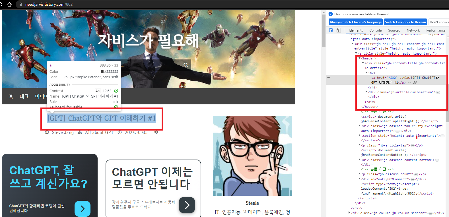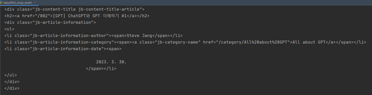 크롤링하는 URL의 제목의 경우 위 이미지 처럼 jb-content-title이라는 클래스에 담겨져 있기도 하며, 현재 포스팅의 경우 title 태그안에도 해당 제목으로 만들어져 있습니다.